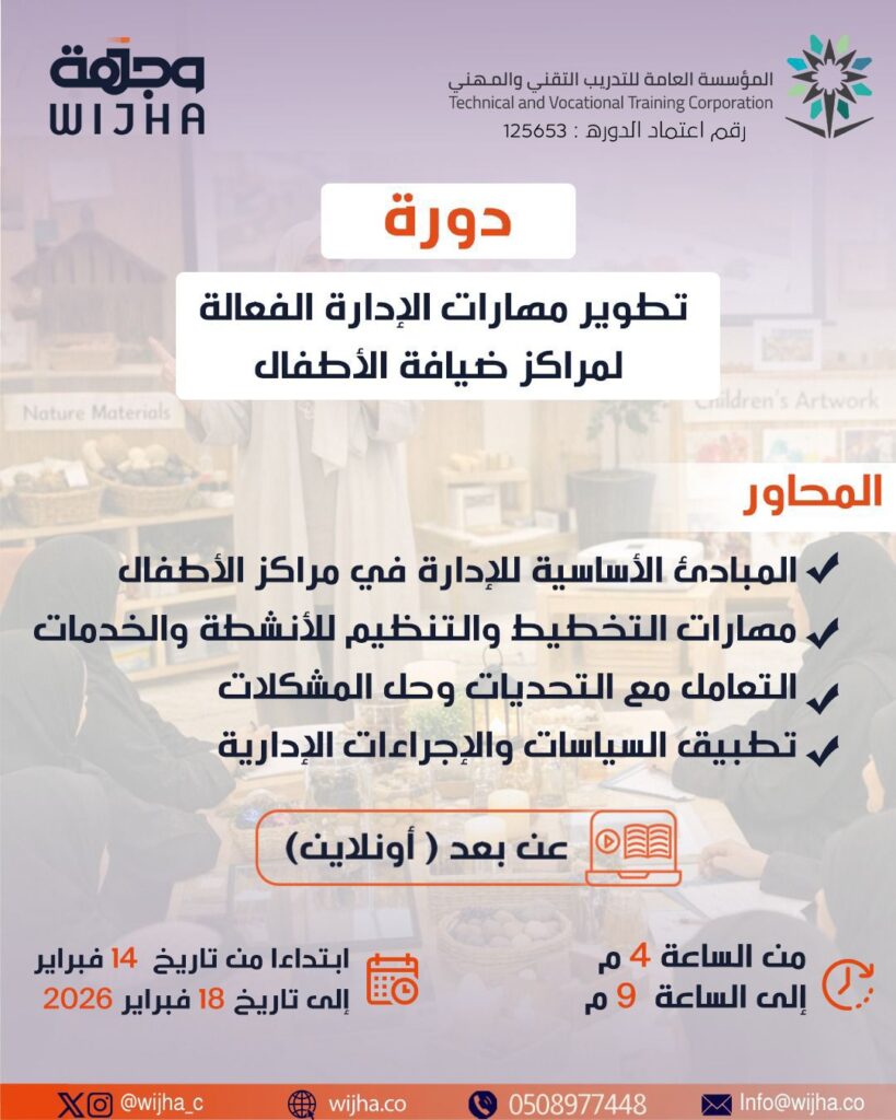 إكساب القيادات المهارات الإدارية والقيادية اللازمة لإدارة مراكز الطفولة بكفاءة واحترافية. تمنح القائدة أدوات الإدارة الحديثة لرفع كفاءة التشغيل وضمان استدامة الجودة . المخرجات: تضع خطط تنظيمية فعالة تضمن تقديم خدمات عالية الجودة . تدير الموارد البشرية والمالية بكفاءة وشفافية . تقود وتحفز فريق العمل لتحقيق أهداف المركز . تتواصل بفعالية مع الأطفال، الأسر، وفريق […]